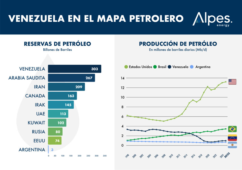 Sin embargo, esa posición de liderazgo en reservas contrasta con una marcada caída en la producción. A fines de los años noventa, Venezuela producía más de 3 millones de barriles diarios y explicaba el 10% de la producción mundial. Hoy, la producción se ubica por debajo del millón de barriles diarios, tras haber tocado mínimos históricos entre 2020 y 2021.