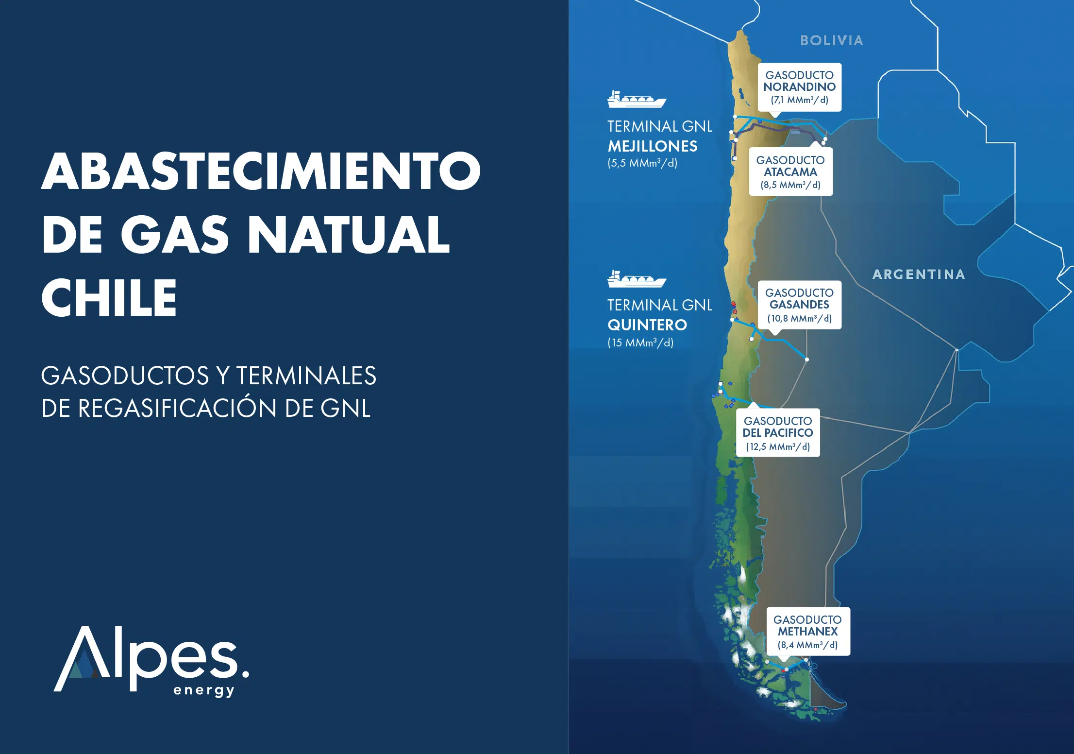 - GNL Quintero – Operativo desde 2009 en la Región de Valparaíso. Capacidad: 15 MMm³/d.