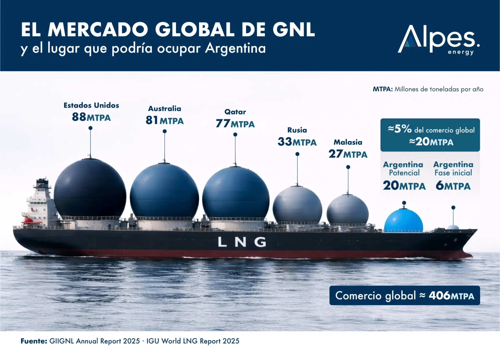 En gas natural, el contexto también se volvió más sensible. El comercio mundial de GNL se ubica en torno a 406 millones de toneladas anuales, con una oferta todavía concentrada en pocos jugadores. Estados Unidos lidera con unas 88 millones de toneladas, seguido por Australia con alrededor de 81 y Qatar con unas 77. Más atrás aparecen Rusia, Malasia, y un segundo grupo relevante formado por Indonesia, Nigeria, Argelia y Omán. En otras palabras, el mercado global es grande, pero la oferta sigue bastante concentrada en pocos exportadores.
