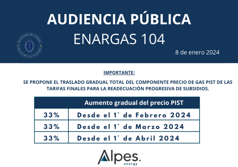 El ministro propone el traslado gradual del precio real del Gas Natural en el PIST (Punto de Ingreso al Sistema de Transporte), con quitas de subsidios y actualización de las tarifas para todos los usuarios con servicio completo de la distribuidora. Esta actualización se empezará a ver reflejada en las facturas de Gas Natural a partir de febrero.