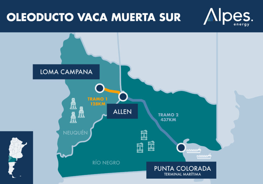 Una tercera obra será clave para terminar de perfilar a Vaca Muerta como una plataforma de exportación de petróleo de escala global: el Oleoducto Vaca Muerta Sur. En mayo, YPF comenzó la construcción del primer tramo, que une a Loma Campana (el yacimiento insignia de la compañía) con la localidad rionegrina de Allen, en la frontera con Neuquén. Son 128 km de caños que comprenden una inversión de USD 190 millones.