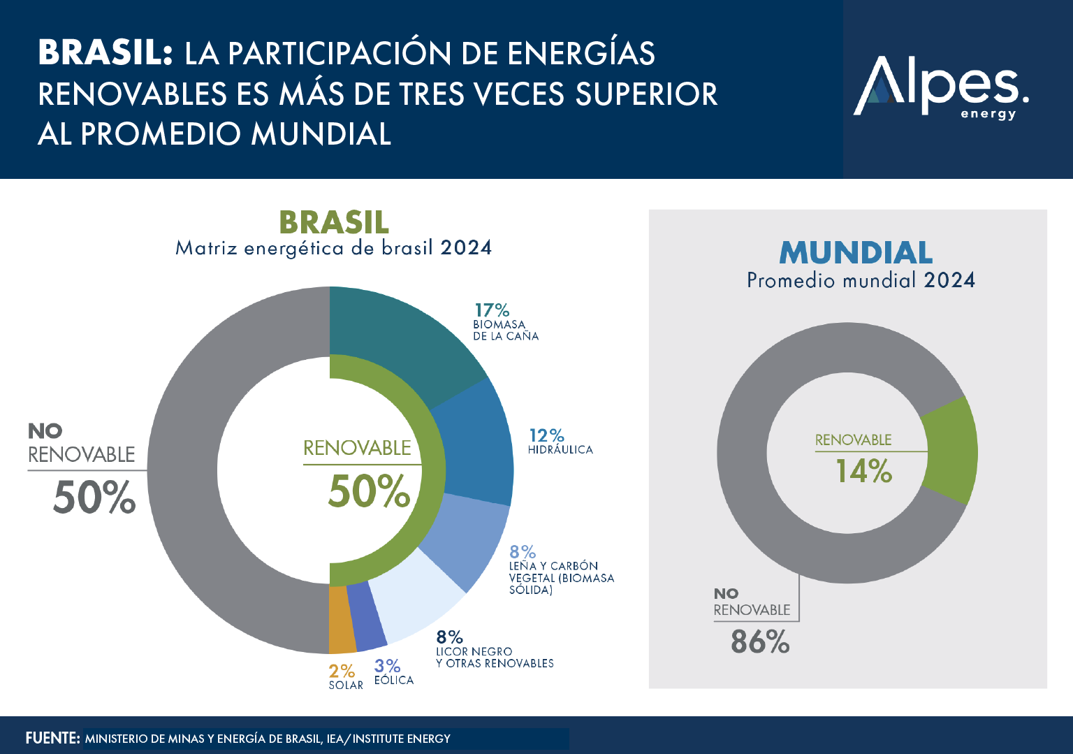 En 2024, las energías renovables que explicaron este 50% incluyeron la biomasa de caña de azúcar, la energía hidráulica, la leña y el carbón vegetal, el licor negro y otras fuentes renovables de origen industrial, junto con la energía eólica y la solar. En conjunto, la biomasa explica más de un tercio de la matriz energética total, reflejando el aprovechamiento energético de recursos agrícolas e industriales propios del país.