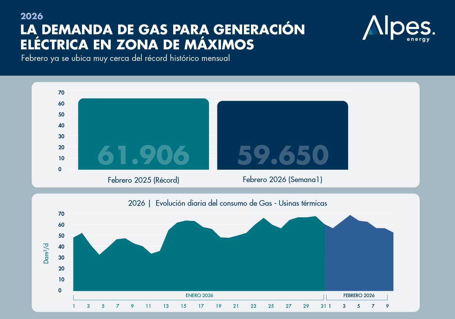 En lo que va de febrero, el consumo promedio de gas natural para generación se ubica en 59.650 Dam³/día, un nivel particularmente elevado para un mes estival impulsado por las altas temperaturas. La cifra no solo refleja la fuerte dependencia del parque térmico, sino que además posiciona al mes muy cerca del récord histórico de consumo mensual, registrado en febrero de 2025 con 61.906 Dam³/día.