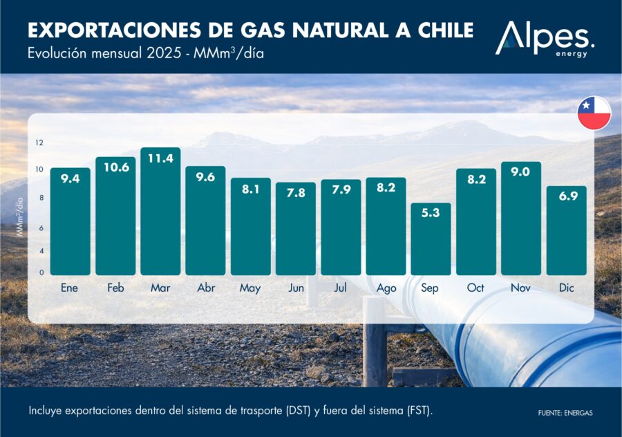 En promedio, durante 2025 las exportaciones de gas natural argentino hacia Chile se ubicaron en torno a 8,5 MMm³/día.
